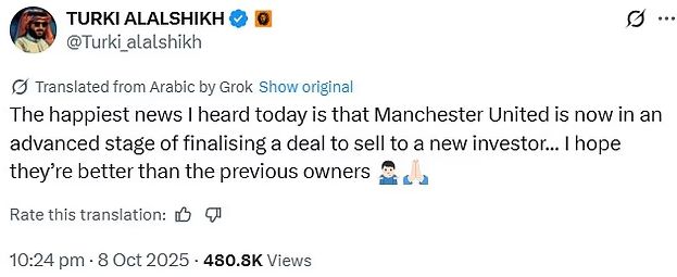 此前,沙特娱乐局局长图尔基-谢赫在社交媒体暗示格雷泽家族将出售曼联,“曼联现在处于完成向新投资者出售的交易后期阶段,我希望他们比之前的老板更好。”