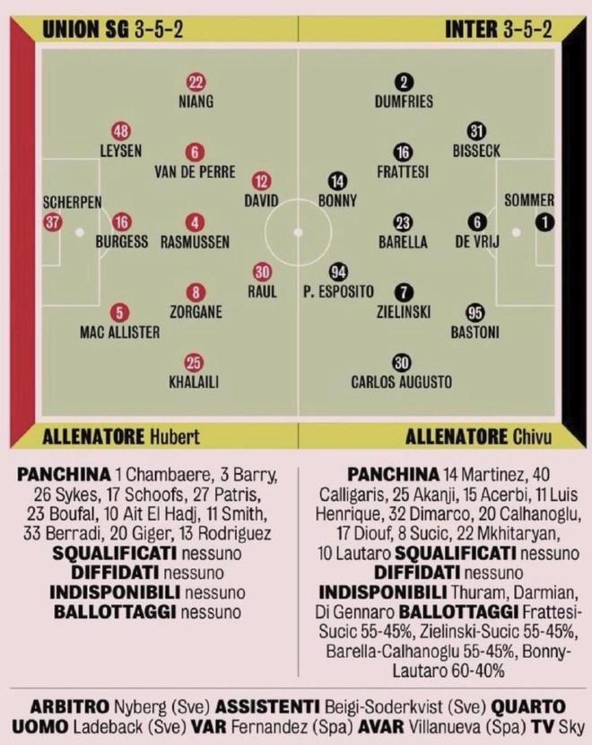 天空体育在此前给出的国际米兰首发阵容如下:(3-5-2)索默;比塞克、德弗赖、巴斯托尼;邓弗里斯、弗拉泰西、恰尔汗奥卢、苏契奇、卡洛斯-奥古斯托;劳塔罗-马丁内斯、皮奥-埃斯波西托。