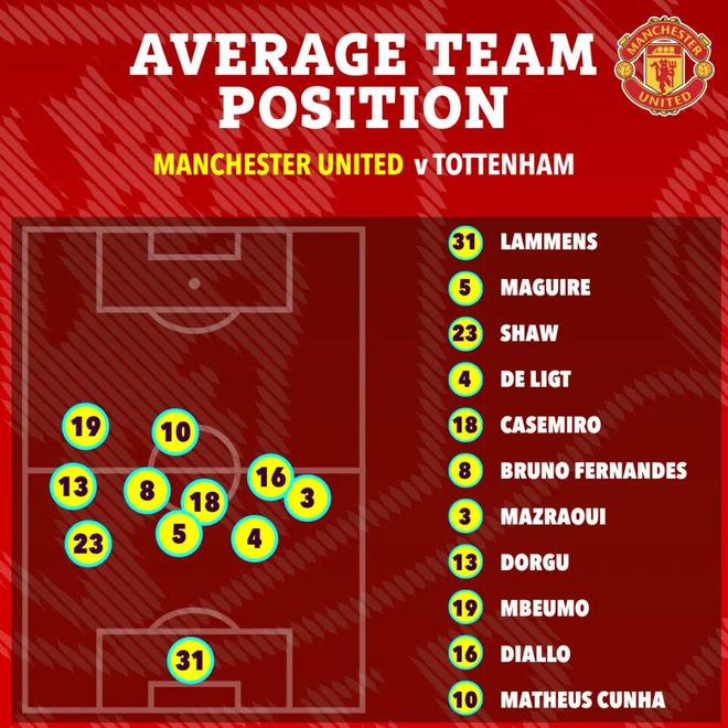 跟本赛季客战强队一样,阿莫林再次安排无锋阵容,库尼亚、姆贝莫和阿马德·迪亚洛组成流动性的锋线,左右边翼卫换成帕特里克·多古和马兹拉维,马奎尔复出替代莱尼·约罗。